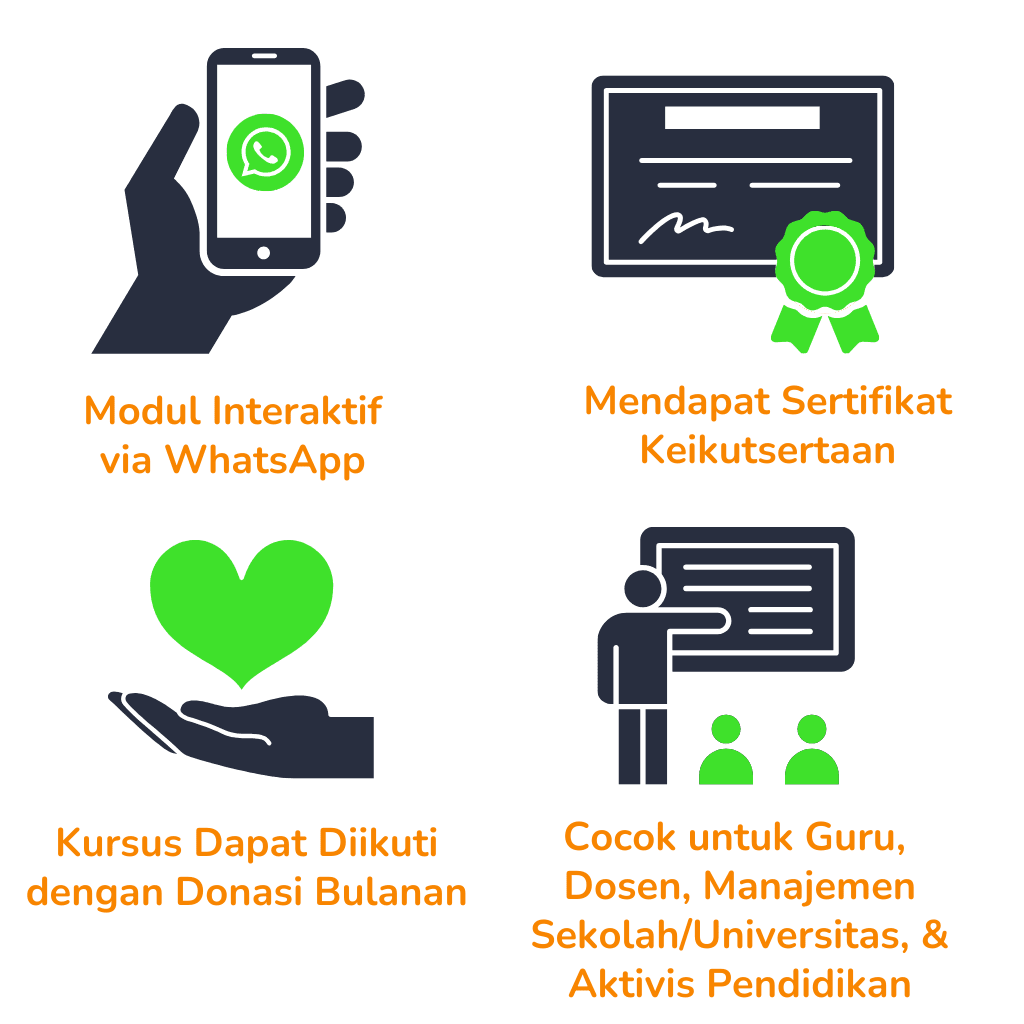 Setelah mendaftar dan melakukan pembayaran, Anda akan menerima email dan/atau pesan WhatsApp untuk mengonfirmasi akun WhatsApp yang akan digunakan untuk menerima modul e-course. Modul e-course akan dikirim secara berkala sesuai dengan jadwal program.